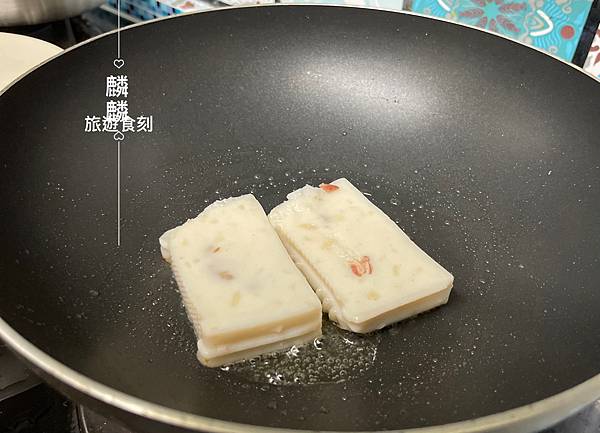 2. 蘿蔔糕切厚片,煎至兩面金黃,放涼後切小塊備用